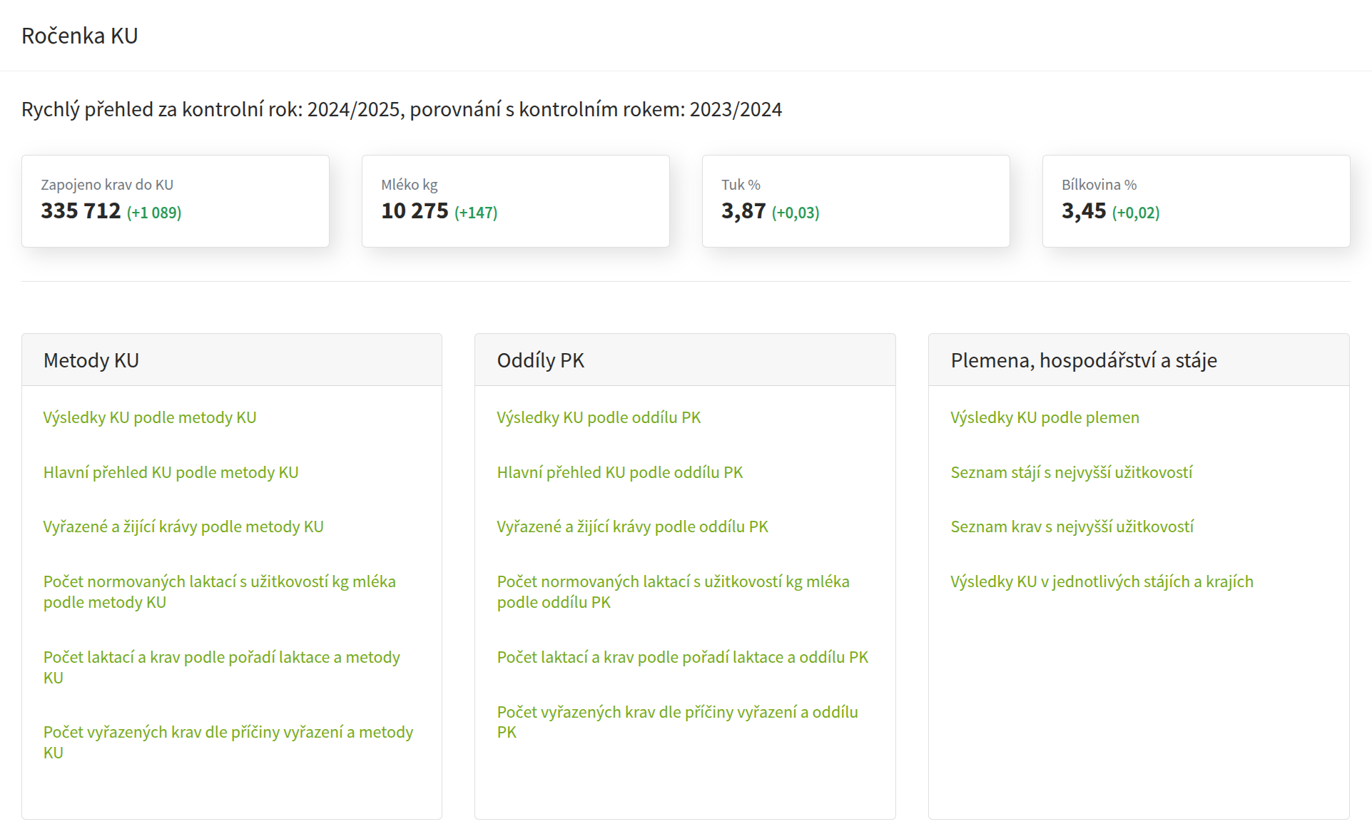 Nový způsob zveřejňování Ročenky KU s sebou přináší také nové možnosti v práci s daty. V rámci reportů je možné provádět filtrování a třídění dat, export do PDF, případně CSV formátu. Zahrnuty jsou také grafické výstupy a možnost porovnání výsledků s předchozími kontrolními roky. Novinkou je také přidání parametru ECM (Energy Corrected Milk), který vyjadřuje množství mléka přepočtené na standardní obsah 3,5 % tuku a 3,2 % bílkovin.